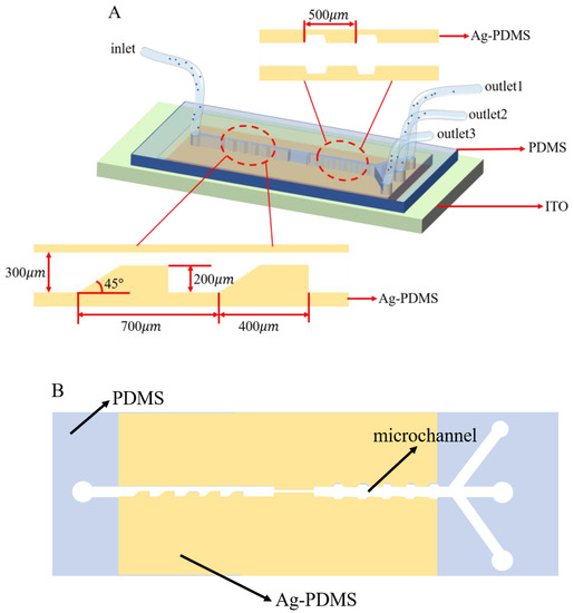 The proposed microfluidic chip consisted of an upper PDMS microchannel, a microchannel sidewall Ag-PDMS and a lower Indium Tin Oxides (ITO) transition electrode. The PDMS microchannel was adopted as the contraction and expansion channel [35]. The Ag-PDMS electrodes covered both ends of the PDMS microchannel sidewalls with the same height as the microchannel to ensure that the non-uniform electric field covered the whole channel. In addition, the length of the electrodes and contraction/expansion microchannels were equal in this microchip to ensure the same processing time of DEP separation and inertial separation. The PDMS microchannel part contained the main channel and four branches that led to one inlet and three outlets. All the microchannels in the devices were 60 µm in height. The structure of the designed microfluidic chip is shown in Figure 1A. The schematic diagram of the microchannel and 3D electrode structure is shown in Figure 1B.