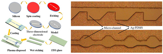 The microfluidic chip fabrication process was mainly divided into two parts: one for the preparation of microchannels and 3D electrodes and another for the preparation of ITO electrodes. The fabrication of the PDMS channel was mainly based on soft lithography [39]. Next, 3D electrodes were prepared. First, PDMS and curing agents in a ratio of 10:1 were fully mixed and their bubbles were removed by the vacuum chamber to form a PDMS curing agent. Next, the high-purity micron silver powder was mixed with the PDMS curing agent in a mass ratio of 86:14. After being fully mixed, the Ag-PDMS was placed in the vacuum chamber to remove bubbles for 1 h. Subsequently, it was applied to the silicon wafer and smoothened with a spatula. The PDMS (prepolymer: curing agent = 10:1) was poured on this mold at 75 for 50 min and then peeled off gently after cooling with Ag-PDMS. The Ag-PDMS was heated to 150 to ensure good electrical conductivity. A transition electrode was needed to connect the 3D electrode to the external wire, which was prepared by the wet etching method using ITO glass. The ITO electrode preparation process is similar to the silicon process. After post-baking, the ITO electrode preparation process was similar to the silicon process. After baking, the ITO glass was placed in the etchant with a solution ratio of 50:50:3 in the order of H2O: HCl: HNO3 at 55 for 100 s. Next, the ITO glass was placed in acetone and ultrasonicated for 5 min to remove the covered positive PR and then placed in ethanol for ultrasonication for 5 min. Subsequently, ITO glass was washed with a large amount of deionized water and dried with nitrogen gas.