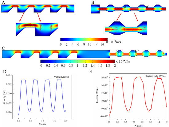 (A) Distributions of the flow field in contraction and expansion of the entrance part; (B) distributions of the flow field in contraction and expansion of the outlet part; (C) distribution of the electric field; (D) a–a’ cross-section of the central part of the CEA channel; (E) electric field distribution of b–b’ cross-section.