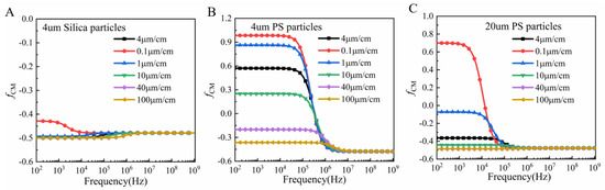 (A) CM factor of the 4 µm polystyrene spheres. (B) CM factor of the 4 µm silica particles. (C) CM factor of the 20 µm polystyrene spheres.