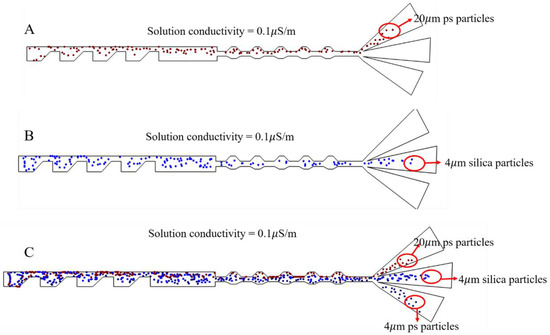 (A) Particle trajectory simulation of 20 µm polystyrene spheres. (B) Particle trajectory simulation of 4 µm silica particles. (C) Particle trajectory simulation of 20 µm polystyrene spheres, 4 µm silica particles, and 4 µm polystyrene spheres.