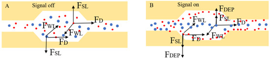 (A) The mechanical analysis when no signal was added (inertial sorting); (B) the mechanical analysis when the signal was applied (coupled with inertial force and DEP force).