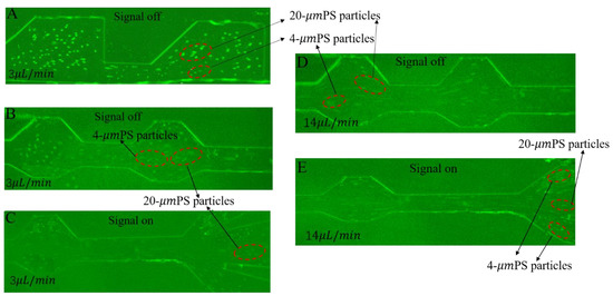 Next, the performance was tested under low flow rate conditions with particles of 4 µm and 20 µm PS spheres suspended in a mixture with a solution conductivity of 4 µS/cm, without and with voltage applied for particle separation. When the particle velocity increased, the time required for the particles to pass through the main channel decreased, and the DEP action time decreased. Consequently, when loading the 3D electrode, the particle flow rate should not be high. Therefore, the particle flow rates to test the particle sorting effect in both the case of no AC voltage and of loaded voltage were 3 and 14 µL/min. When no AC voltage was applied to the electrodes, the particles showed a random motion in the channel at a flow rate of 3 µL/min. When the flow rate increased to 14 µL/min, the sorting effect of the two particles was not obvious, although the particles were subjected to inertial force under the action of the CEA channel.