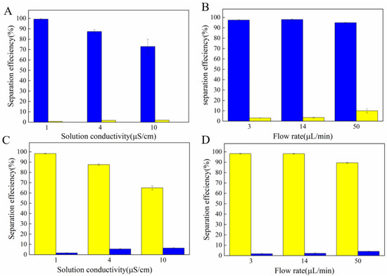 Statistics of separating efficiency under the parameters of different solution conductivities and flow rates. (A,B) Middle channel; (C,D) branch channels.