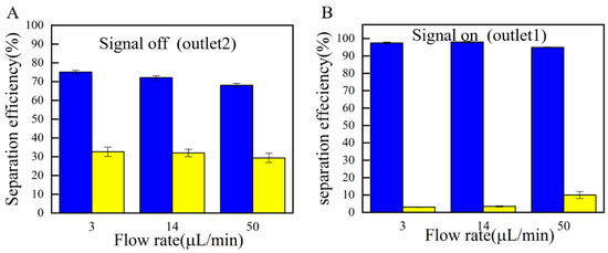 Figure 9A, B shows the sorting efficiency with inertial force only and a combination of DEP force and inertial force when the flow rates changed from 3 µL min−1 to 50 µL min−1 at outlet 2. When no electric signal was applied, the sorting efficiency was relatively low.
