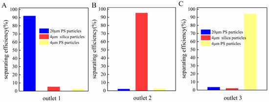 At a solution conductivity of 0.1 µS/cm, three particles (4 µm and 20 µm PS spheres and 4 µm silicon dioxide microspheres) were suspended in the medium and moved randomly into the main channel. At this time, both 4 µm and 20 µm polystyrene spheres were subjected to pDEP; the radius of the 20 µm particles was four times that of the 4 µm particles. Thus, under the joint action of the DEP force, inertial force, and drag force, the 20 µm particles were subjected to a much larger force than the 4 µm particles. Therefore, the 20 µm particles were deflected towards exit 1, and the 4 µm particles were deflected to exit 3; the 4 µm silica particles were deflected to exit 2 due to the nDEP’s action. Supporting video can be found in the Supplementary Information (Video S1). Figure 10A–C shows the separation process of the three kinds of particles. The sorting efficiency for the 4, 20, and 4 µm particles was more than 90%.