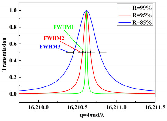 On the basis of Equation (2), the full width at half maximum (FWHM) of the transmission curve expressed by the phase can be deduced as