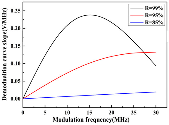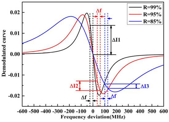 In the sensing process of the FOAS, the change in the air refractive index caused by the sound pressure results in a shift of the resonance frequency, which is proportional to the change in sound pressure. Since the frequency difference generated by the resonance frequency shift of the FPE is very weak, it is difficult to be measured directly. Phase modulation spectroscopy technology is used as the acoustic demodulation method for the detection of acoustic signals. The weak frequency difference signal can be amplified and extracted by means of phase modulation and lock-in amplification technology. Then, according to the correspondence relationship between the resonance frequency shift and the demodulated curve, the demodulated curve is used as an error signal to feedback and control the laser so that the laser frequency can track and be locked at the resonance frequency. After frequency locking, the effect of the acoustic signals on the resonance frequency corresponds to the offset of the locked demodulated curve relating to the null point. The working principle of the light field and electric field in the detection process of phase modulation spectroscopy technology has been analyzed in detail in our previous work. According to Equation (5) of Reference [34], the demodulated curves of FPE with different reflectivity can be simulated, as shown in Figure 5. Figure 5 illustrates that the greater the reflectivity of the FPE, the greater the slope of the demodulated curve. For a given resonance frequency offset, the amount of change in the linear amplitude of the demodulated curve, that is, the sensitivity of the FOAS, depends on the slope of the demodulated curve. Therefore, the sensitivity of the FOAS based on FPE with high reflectivity will be greater.
