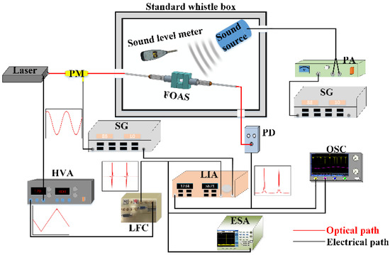 The acoustic performance test system diagram of FOAS. The optical path is drawn in red and the electrical path is drawn in black.