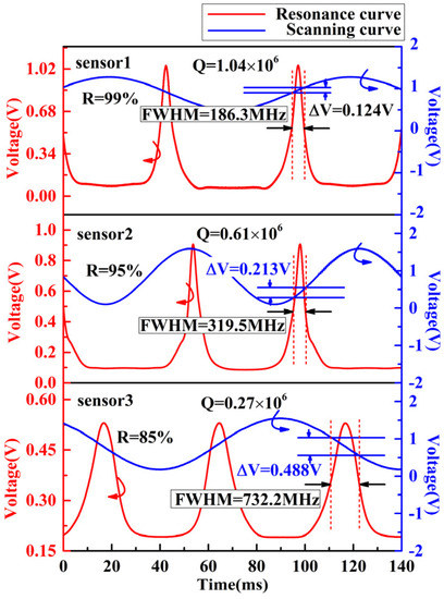 In order to test the characteristics of the three FPEs and the acoustic performance of FOASs, the acoustic performance test system is set up as shown in Figure 7. The triangular wave signal output by the lock-frequency controller (LFC) is amplified 100 times by the high voltage amplifier (HVA, YG2009A-350V-2bip) and then applied to the PZT scanning port of the laser (NKT E15) to sweep the laser frequency, so that the resonance spectrum of FPE can be obtained on the oscilloscope (OSC, MDO4104C). Figure 8 is the resonance spectrum of the used FPEs with reflectivity of 99%, 95% and 85%, of which, the sampling rate is 50 kHz. According to the relationship between the resonance spectrum and the scan curve, the FWHM of the resonance spectrum can be obtained from the voltage difference in the scan curve corresponding to its half height and the PZT tuning coefficient of the laser that is 15 MHz/V. Due to the fact that the voltage of the scanning curve observed on the oscilloscope is 100 times lower than the scanning voltage applied to the laser, the calculation formula for the FWHM of the resonance spectrum is . Therefore, the Q factors of sensor 1, sensor 2 and sensor 3 can be calculated as , and .