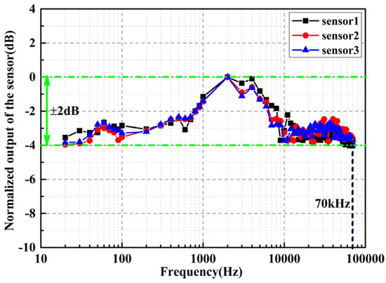 By applying acoustic signals with a constant amplitude and frequency ranging from 20 Hz to 100 kHz to the FOAS, the frequency domain response of the FOAS to the acoustic signals can be directly collected from the electrical spectrum analyzer (ESA, N9030A). The collected frequency response amplitudes are normalized to dB to obtain the frequency response characteristic of the FOAS. Figure 9 shows the frequency response curves of the three FOASs, from which, the frequency response from 20 Hz to 70 kHz with a flatness of 2 dB is achieved. Moreover, the sampling rate of the response spectrum from 20 Hz to 70 kHz collected from ESA is 546.99 Hz (frequency range from 20 Hz to 90 Hz), 4955.45 Hz (frequency range from 100 Hz to 900 Hz) and 88,584.07 Hz (frequency range from 1 kHz to 70 kHz), respectively. Here, the three sensors are the FOASs with Q factor of , and , respectively. The experimental results fully prove the correctness of the theory that the frequency response of the FOAS based on the rigid FPE is only related to the diameter of the incident laser beam. This wideband response covers the ultrasonic frequency range from 20 kHz to 70 kHz, and they can be used as an ultrasonic receiver in ultrasonic nondestructive testing technology. This method of industrial non-destructive testing through FOASs has the advantages of a resonance-free response and much reduced dead zone compared to the method of measuring vibration characteristics through a vibration accelerometer. The difference between the measured frequency response range and the theoretically measurable frequency bandwidth of the FOAS is mainly due to the limitation of the feedback control mode of the laser, the response speed of the lock-frequency controller and the bandwidth of some other electrical components in the demodulation system. In the subsequent work, a full closed loop detection method based on phase modulation would be adopted. The center frequency of the laser would be locked at the resonance frequency of the FPE in real time, and the acoustic signal can be detected by reading out the feedback error signal controlling the laser, which can greatly expand the frequency response bandwidth.
