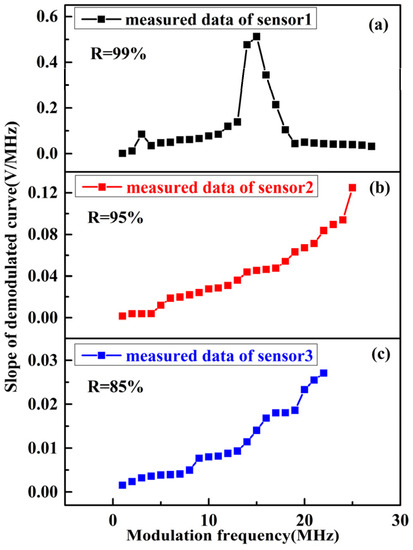 The measured changes in the slope of the FPE demodulated curve with different Q factors under different modulation frequencies: (a) R is 99%; (b) R is 95%; (c) R is 85%.