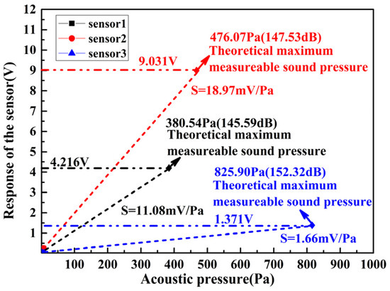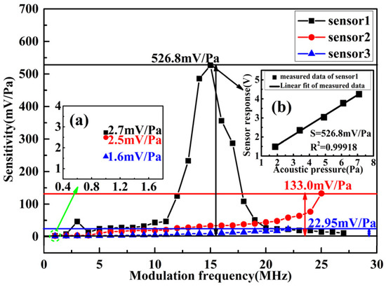 Moreover, the sensitivity of the FOAS is also associated with the Q factor of the FPE. The higher the Q factor, the greater the sensitivity that can be obtained. As can be seen from Figure 11, the average sensitivity of sensor 1 is the highest, followed by sensor 2, and sensor 3 is the lowest in the process of changing the modulation frequency. The three FOASs achieve maximum sensitivities of 526.8 mV/Pa, 133.0 mV/Pa and 22.95 mV/Pa, respectively. Another performance index corresponding to sensitivity is the minimum detectable sound pressure. The greater the sensitivity, the stronger the ability of the FOAS to pick up weak sound signals; that is to say, the minimum detectable sound pressure (MDP) is smaller. The equation for calculating the MDP is defined as