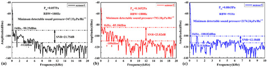 When the maximum sensitivities of the three sensors are obtained, the 1 kHz signals with the minimum sound pressure that the sensors can respond to are tested, and the response spectrograms are shown in Figure 12. According to Equation (7), the minimum detectable sound pressures can be obtained as , and , corresponding to the minimum detectable sound pressure levels of 24.79 dB, 31.97 dB and 40.73 dB, separately. The calculated results fully indicate that sensor 1 with a high Q factor has the strongest ability to detect weak acoustic signals.