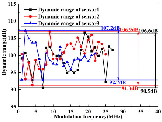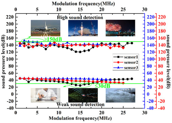The dynamic range of the FOAS is also one of its important performance indicators, and is determined by the maximum and minimum detectable sound pressure, respectively. As demonstrated in Figure 13, the dynamic range of the three sensors under a modulation frequency from 1 MHz to 27 MHz are tested. We can conclude that the three sensors have achieved a large dynamic range greater than 90 dB. Moreover, as the Q factor decreases, the dynamic range increases. In particular, the larger dynamic range of 107.2 dB is achieved by sensor 3, which is better than sensor 1 and sensor 2. This is mainly due to the fact that sensor 3 exhibits a higher maximum detectable sound pressure. The maximum detectable sound pressure is determined by the sensitivity and the amplitude of the linear region of the demodulated curve. Figure 14 exhibits the maximum detectable sound pressure that can be achieved by the three sensors under different modulation frequencies. Among them, with a Q factor of , the FOAS achieves a maximum sound pressure detection of 152.32 dB, which is 4.79 dB and 6.73 dB higher than the FOASs based on the FPEs with Q factors of and , respectively.