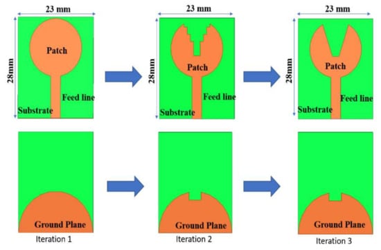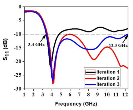 The proposed antenna structure is obtained by a series of evolution processes represented in Figure 2. In iteration 1, the antenna has a full circular radiating patch with a semicircular ground plane, which results in a narrow −10 dB impedance bandwidth from 3.4 to 4.8 GHz. There exists very poor impedance matching. To make a UWB, the impedance bandwidth is to be made wide. In iteration 2, Staircase slots are introduced on the circular radiating patch. A slot of rectangular shape is truncated on the semicircular ground plane. This is shown in iteration 2 of Figure 2. Compared to iteration 1, the impedance bandwidth is 3.5 to 12.3 GHz, but impedance matching is very poor, since the reflection coefficient curve touches a −10 dB line at 6 GHz frequency. Therefore, further modification is done in iteration 3 of Figure 2 to achieve UWB characteristics in the antenna. The staircase slots on the radiating patch are now cut into V-shape slots alongside keeping the truncation on the semicircular ground plane constant.