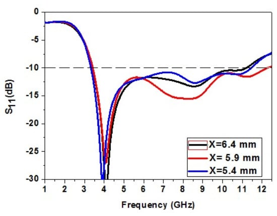 The effect of dimension X of the patch element on the antenna is studied. The dimension X of the element is increased and decreased to analyze its effect. The increase in X causes a decrease in impedance bandwidth. The reduction in X causes a slight rise in impedance bandwidth but is not as accepted. The dimension X = 5.9 mm gives the correct bandwidth. So, X = 5.9 mm is an optimized value. The variation of dimension X of the patch is shown in Figure 4.