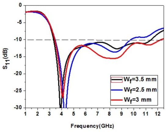 The effect of the feed width Wf of the patch element on the antenna is studied. The feed width Wf is increased and decreased to analyze its effect. The increase in Wf causes a decrease in impedance bandwidth. The reduction in Wf also causes a greater decrease in impedance bandwidth. The feed width Wf = 3 mm gives the correct bandwidth of 12.3 GHz. So, Wf = 3 mm is an optimized value. The variation of the feed width Wf of the patch element is shown in Figure 6.