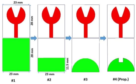 Figure 7 shows the effect of variation of ground plane structure on the proposed design. In #1, the design has a full rectangular ground plane, which results in a narrow −10 dB impedance bandwidth from 8.4 to 10.2 GHz. To make a UWB, the impedance bandwidth is to be made wide, and truncation is done on the ground plane to make it a partial rectangular ground plane. This is shown in #2 of Figure 7. Compared to #1, the impedance bandwidth is 3.4–9.3 GHz, but it is not proper enough.