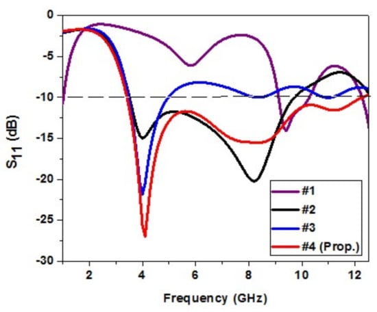 It is now evident that the S11 < −10 dB bandwidth is 3.4 to 12.3 GHz, exhibiting ultrawide bandwidth. It has good impedance matching. Hence, the antenna has a resonating mode at 4.1 GHz and FBW of 113%, covering the entire UWB spectrum. Figure 3 illustrates the reflection coefficient of the evolutionary steps in the antenna design.