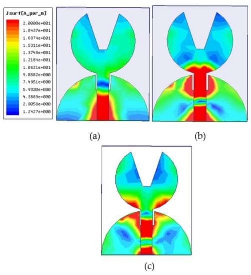 The current density is shown in Figure 9a–c at 4.21, 8.61, and 11.2 GHz, respectively. The current pattern at the first, second, and third resonance frequencies of 4.1, 8.61, and 11.2 GHz depict first, second, and third harmonics, respectively. From the current distribution pattern, it can be stated that the majority of the currents are found around the edge of the radiating patch and the ground plane, while the currents at the center of the patch and ground plane are very weak. It is also seen that the current is coupled from the top and bottom edge of the ground plane to the patch through the microstrip feed line and radiates to the free space. The truncation on the top edge of the partial ground plane effectively alleviates the changes in antenna impedance by altering the current path and creating a symmetrical current distribution to a small ground plane, reducing the effect of the ground plane on the antenna’s performances. However, the currents are mainly distributed on the microstrip line and the junction between the patch and ground plane at higher frequencies. As a result, the currents on the ground plane become stronger than the lower frequencies, and impedance matching becomes worse for traveling wave-dependent modes.