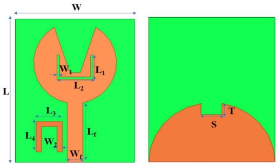 Figure 10 represents the dual band-notched antenna’s geometry, with the top having V-shape slots and a U-shape truncated semicircular ground plane at the bottom.