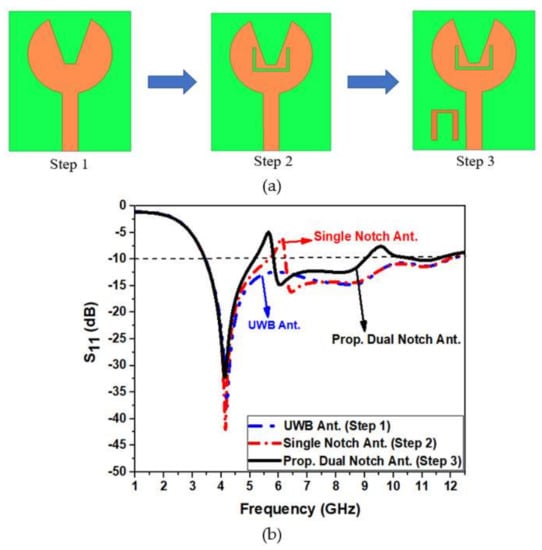 Implementation of (a) a dual notch in UWB antenna design and (b) corresponding S11 of the implementation stage.