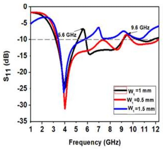 Figure 12 shows the variation of width W1 of a U-shaped slot of the radiating patch. As W1 is decreased by 0.5 mm, only one band notch appears at 9.6 GHz. When W1 is increased by 0.5 mm, two notch bands are not proper, and the bandwidth is reduced. When W1 = 1 mm, there are two proper notch bands with a sharp rejection at 5.6 GHz and 9.6 GHz, respectively. Therefore, W1 = 1 mm is the most optimized value for a dual-band UWB notch antenna.
