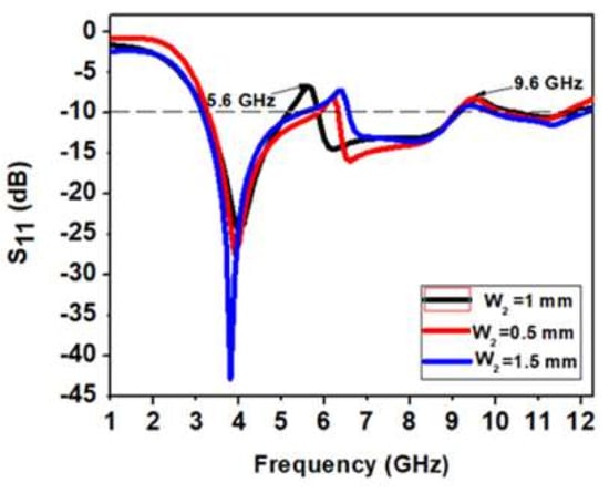 Figure 13 shows the variation of width W2 of the U-shaped parasitic resonator. As W2 is decreased by 0.5 mm, there is a shift in the notch band toward higher frequency, and the impedance bandwidth is reduced. When W2 is increased by 0.5 mm, there is a shift in the first notch band toward a higher frequency, and the second notch band to the −10 dB line. In addition, the impedance bandwidth is reduced. When W2 = 1 mm, there are two proper notch bands with a sharp rejection at 5.6 GHz and 9.6 GHz, respectively. Therefore, W2 = 1 mm is the most optimized value for a dual-band UWB notch antenna.