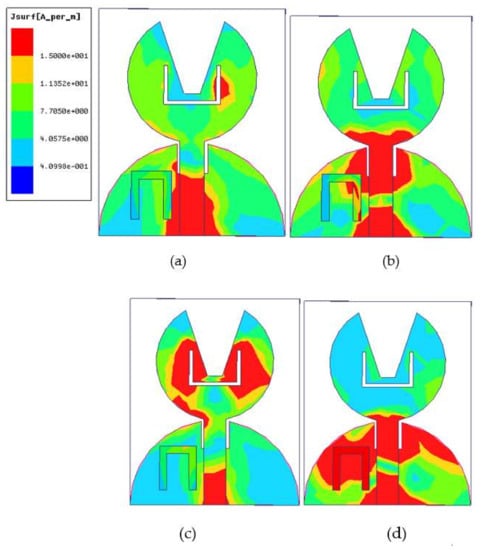 Figure 14 shows the density of current of the designed UWB notch antenna at two passband frequencies (i.e., 4 and 6.2 GHz) and two-band notch frequencies (i.e., 5.6 and 9.6 GHz). At a resonant frequency of 4 and 6.2 GHz, the region colored in red in Figure 14a,b shows that the current density is highest in most of the radiation, while the current density is fairly uniform in other regions. The high current density is visible near the sharp edges of the slot, parasitic resonator, and feed line. At the WLAN band of Figure 14c, the current distribution is concentrated near the slot’s outer and inner edges in the patch at a band notch frequency of 5.6 GHz. Since the field generated near the slots is opposite in direction, they are responsible for notching the WLAN band’s frequency. Similarly, the current distribution is concentrated in the parasitic resonator responsible for the X-band frequency band. At 9.6 GHz (Figure 14d), the current density generated in the resonator due to magnetic flux generated in the feed line causes the induced current to flow in the resonator to neutralize the field generated in both the arms of the resonator. Therefore, the band-notched characteristic is obtained for the UWB notch antenna.