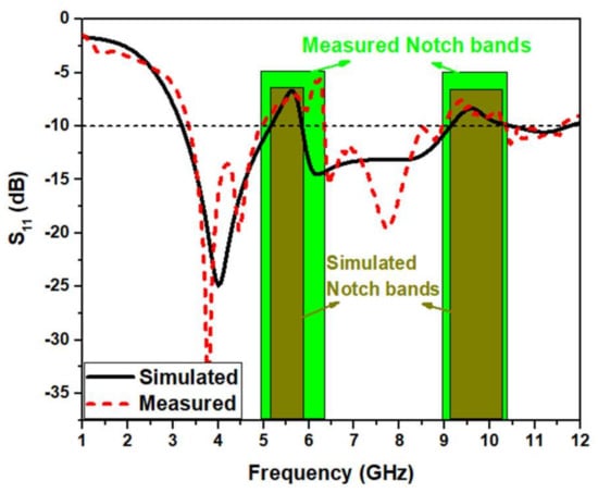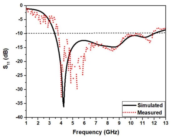 Figure 16 shows the comparative analysis of the simulations and measurements of S11. S11 was measured using a ROHDE and SCHWARZ ZVL network analyzer. The simulated impedance bandwidth is 3.4–12.3 GHz at S11 < −10 dB level. The measured operating impedance bandwidth is 3.74–11.83 GHz at S11 < −10 dB level. There is a slight deviation between the simulations and measurements of S11. It is due to the effect of soldering, not considering the SMA connector during simulation, uncertainties in the substrate’s dielectric constant, and tolerances in fabrication.