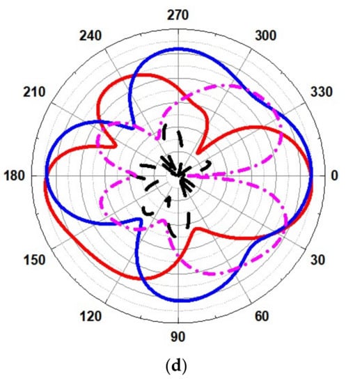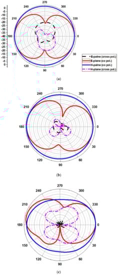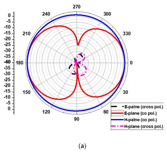 The radiation pattern obtained for operating frequencies of (4.2 GHz, 5.8 GHz, 8.6 GHz, and 11.2 GHz) for ∅ = 0° (H-plane) and ∅ = 90° (E-plane) is outlined in Figure 17. The simulated results show that the pattern of radiation in the H-plane is near omnidirectional, and in the E-plane, it is bidirectional and stable.