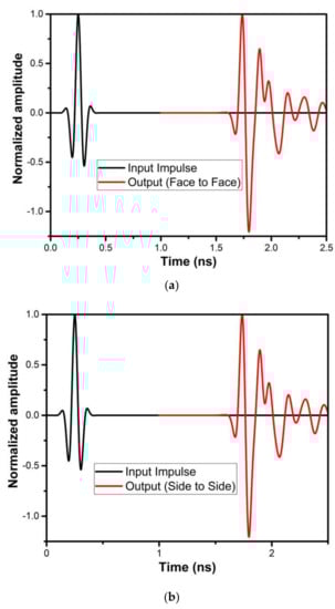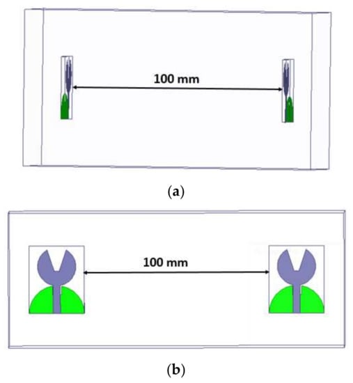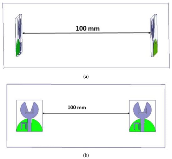 The analysis of the designed antenna in the time-domain viz., comprising of the phase response, group delay, and isolation characteristics, is performed. These studies have been performed by placing two antennas that are identical with a spacing of 100 mm in HFSS, as shown in Figure 18. Both lateral and frontal conditions have been used for performing the time-domain analysis.