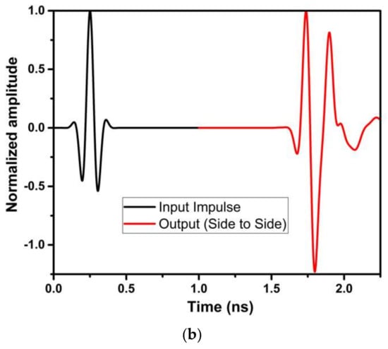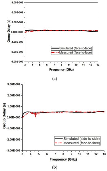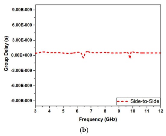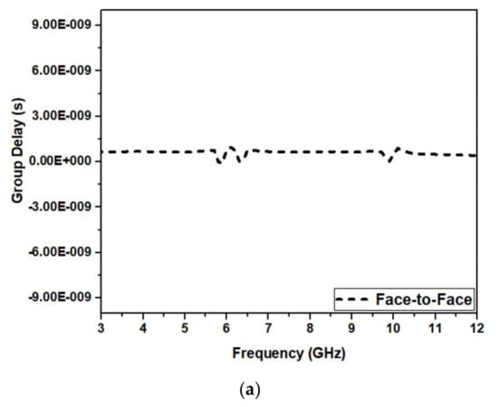 The group delay for our design in frontal and lateral orientations is shown in Figure 28a,b, respectively. Conventionally, the group delay should be constant for the frequency of operation except for the notches. Figure 28a,b show that values for group delay are <1 ns and constant except at the notched bands.