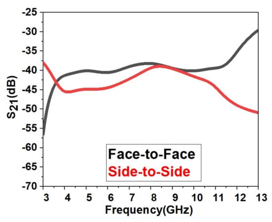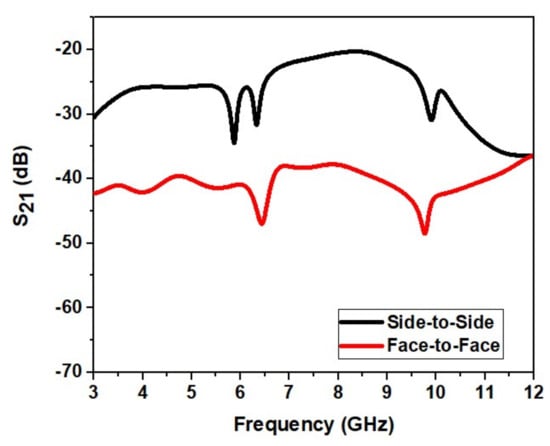 Figure 29 shows the proposed UWB notch antenna’s isolation characteristics (S21). Figure 29 shows that acceptable isolation characteristics are obtained by the designed antenna (S21 < −25 dB) in frontal and lateral conditions.