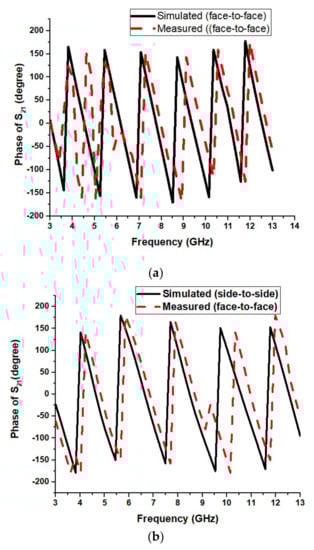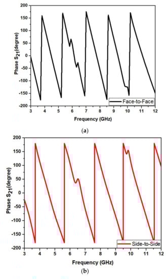 Figure 30a,b show the proposed UWB notch antenna’s phase response. Conventionally, the phase response should vary linearly for the operational frequency band and not in the notched bands. It is observed from the above figure that the phase response for both frontal and lateral configuration are almost linear.