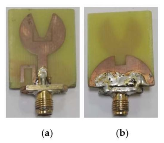 - Patre, S.R.; Singh, S.P. Study of microstrip line-fed flower-shaped patch antenna providing enhanced bandwidth and radiation efficiency. Microw. Opt. Technol. Lett. 2016, 58, 2041–2046. [Google Scholar] [CrossRef]