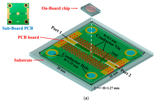 A 3D view of our proposed sub-board PCB is presented in Figure 8a, and an actual PCB image is shown in the inset image. The substrate used in the PCB artwork is RT/Duriod 5870 with a dielectric constant of 3.5, loss tangent of 0.0018, thickness of 1.27 mm, and total dimensions of 20 × 20 mm. A total of 120 conductor vias with a radius of 0.3 mm and a center interval of 1 mm are distributed on both sides of the feedlines for the sake of microwave constraint and loss reduction. Additionally, four conductor holes with a radius of 1.25 mm were designed on the four corners of the PCB board for the screw installation and to further fix the device under test. The BPF chip, installed on the PCB board with conductive paste, is connected to the feedlines with Au bonding wire. Additionally, a conductor hole is grounded under the BPF chip to further ensure the ground connection. To prove the proposed PCB has minuscule signal loss when transmitting microwave signals, we connected two feedlines to form a pathway, as shown in Figure 8b. The simulation and measurement results are illustrated in Figure 8b. It is evident from the graph that in the frequency range from 45 MHz to 10 GHz, both the simulated and measured return losses are less than −12.16 dB, and the insertion loss is exceedingly close to 0 dB. There is a fluctuation in the insertion loss at 6.86 GHz, which can be attributed to calibration and welding errors. The results successfully prove that our designed PCB possesses excellent transmission performance; thus, it can be applied to carry the BPF chip.