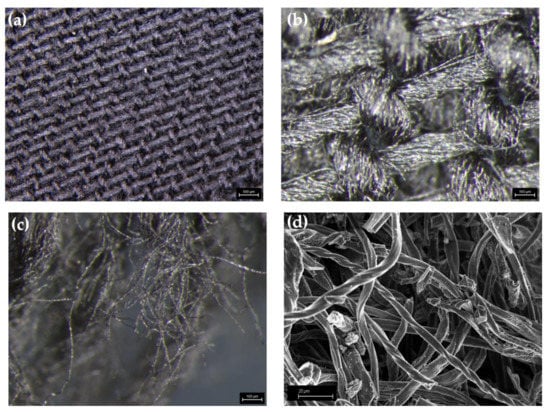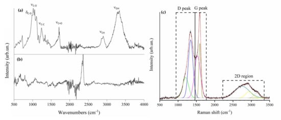 Neat and pyrolyzed cotton fibers were analyzed through FT-IR (Nicolet 5700, Thermoscientific, Waltham, MA, USA) on an attenuated total reflectance (ATR) mode (Smartorbit, Thermoscientific, Waltham, MA, USA) in the range from 500 to 4000 cm−1, and through Raman spectroscopy using Renishaw® Ramanscope InVia (H43662 model, Gloucestershire, UK) using a green laser light source at 514 nm in the range from 500 to 3500 cm−1.
