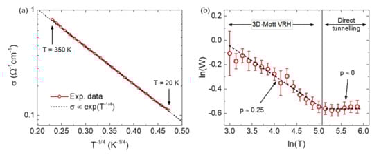 Figure 3a shows that strongly decreases as the temperature is reduced from to K. Unlike in the tea-leaf [] biochars where scaled as a power law of , here, we observe that scales as with K, as highlighted by the black dashed line. According to the theory of the insulator-to-metal transition [,,], such a behavior is typical of insulating materials where electric transport occurs via variable-range hopping (VRH) of the three-dimensional (3D) Mott type. This was confirmed by means of Zabrodskii analysis [] of the reduced activation energy, as shown in Figure 3b. Between and , linearly decreases with increasing with a slope p = 0.25, perfectly consistent with 3D Mott VRH. For , a saturation is instead observed in the values of W shown in panel b, corresponding to the slight deviation in the values of from perfect VRH scaling observed in panel an in this higher T range. This suggests the occurrence of a crossover in the dominant conduction mechanism from VRH at low T to direct tunnelling between sp2 domains across sp3 boundaries at high T, as also reported in superhard carbon nanocomposites [].
