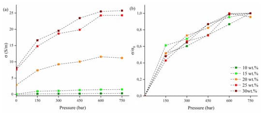 The neat PVA matrix did not show any appreciable conductivity in any range of pressure analyzed. As shown in Figure 4a, WCB-containing composites filled with 10 wt.% and 15 wt.% had a very poor conductivity up to 1 and 95 mS/m without any pressure applied. Interestingly, we observed a conductivity increment up around 10 times for both composites applying 150 bar, reaching 0.159 S/m (10 wt.%) and 0.970 S/m (15 wt.%). Further pressure increments led to a quasi-linear increment of conductivity for both composites reaching 0.306 S/m (10 wt.%) and 1.52 S/m (15 wt.%) at a pressure of 750 bar. By increasing the WCB concentration, we observed an increase in conductivity up to 2.90 S/m for the composites filled with 20 wt.%, and up to 7.5 S/m for 30 wt.%. High-filled composites (20–30 wt.%) displayed an absolute increment of conductivity up to 7–16 S/m after applying 150 bar of pressure, but an inferior relative increment compared with low-filled composites (10–15 wt.%) which about doubled their initial conductivity.