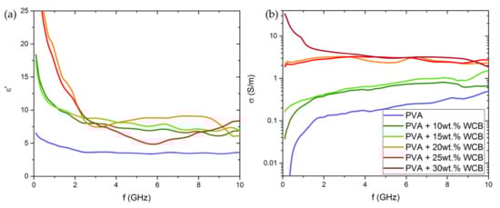 The electrical performances in the high-frequency regime reported here are consistent with those observed studying similar systems. El Shami [] reported that the dielectric permittivity of PVA enriched with carbon quantum dots strongly decreased with increasing frequency, analogous to what we found in our WCB-based composites. By using a WCB content larger than 20 wt.% at frequencies above ~4 GHz, we achieved values of both ε’ and σ comparable with the reflection loss of PVA filled with MWCNT and polyaniline–MWCNT []. At low frequencies, the values of ε’ measured in WCB-filled PVA were quite similar to those reported for nanostructured fillers, such as MWCNT in the PVA matrix [,]. Moreover, our WCB-based composites exhibited conductivity values close to those observed for PVA composites filled with polyaniline-coated carbon fibers []. These evidences suggest that WCB was a valid green alternative to other common carbonaceous fillers.