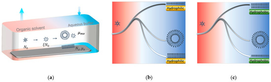We consider the reaction chamber as a thermodynamic system, since the rate of aqueous buffer injection is much slower than the rate of lipid bilayer formation on the substrate. It is noted that the effect of solvent exchange kinetics is taken into consideration by introducing a scaling factor, , which is defined as the ratio of the time average of the lipid concentration during solvent exchange (see Supplementary Materials) to the initial lipid concentration. In the reaction chamber in Figure 1a, the lipids initially in the form of inverted micelles in the solvent self-assemble into either supported lipid layers (a bilayer on hydrophilic substrates and a monolayer on hydrophobic substrates) or suspended lipid structures (i.e., conventional micelles and vesicles) after the system reaches equilibrium. Assuming that the total initial number of lipids in the reaction chamber is , the number of lipids available for adsorption on the substrate is . Denoting the number of lipids in the supported lipid layer as , the number of lipids re-assembled into suspended lipid structures is thus given by . The system free energy is given as: