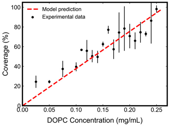 Our model predicts that the SLB surface coverage percentage is linearly dependent on the initial lipid concentration according to Equation (3). This prediction has been confirmed by our experimental characterization (black solid circles with error bars in Figure 2). Experiments were carried out at a fixed temperature of 24.0 ± 0.5 °C, with the initial DOPC lipid concentration ranging from 0.025 mg/mL to 0.25 mg/mL in isopropanol solution. A microfluidic chamber with a silicon-dioxide-coated sensor substrate was used. An aqueous buffer (10 mM Tris, 150 mM NaCl, pH 7.5) was slowly infused into the isopropanol solution containing lipids. Upon this solvent-exchange step, the formation of DOPC SLB () was measured by the QCM-D technique. The frequency shift of the complete DOPC SLB () formed in our experiments was measured to be -25 Hz. Figure 2 shows excellent agreement between the model prediction and the experimental data. Based on our experimental setup [31] and model assumption (see Supplementary Materials), we set , , , and . Linear least squares fitting the experimental data to Equation (3) predicts that . This is consistent with our understanding of energetics in Section 2.1 ( for cylindrical lipids) and close to reported values [43].