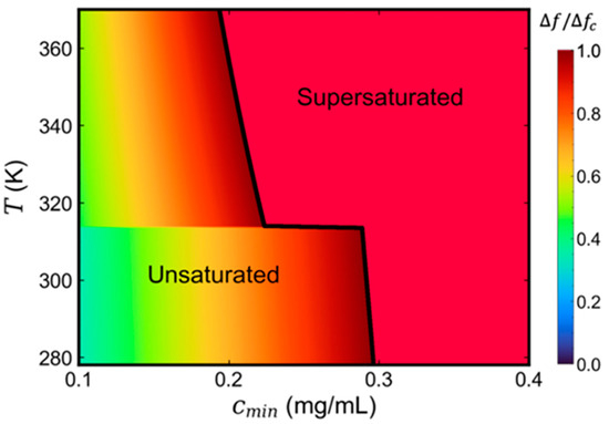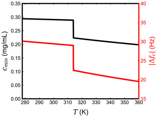 Equations (6) and (7) enable us to predict the temperature effect on both the QCM-D frequency signal corresponding to a complete SLB and the minimum lipid concentration to form a complete SLB. Based on existing computational and experimental data for DPPC lipids, , , , , , [47,48,49], and [43]. Figure 3 shows that both and monotonically decrease with the increase in temperature and follow a similar trend when the temperature is above or below . At , there is a sudden drop in both quantities due to the gel-to-liquid phase transition. The predicted drop in has been demonstrated in previous experiments [30]. In our experiments using 0.5 mg/mL DPPC in isopropanol, the final frequency shift upon complete SLB formation changed from −36.5 Hz in the gel phase at 297 K to −29.7 Hz in the liquid phase at 323 K, which represents a 21% surface mass density reduction.