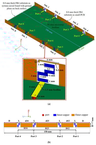 Geometry and dimensions of the proposed triple-band eight-element antenna array in millimeters: (a) Prospective view; (b) Side view.
