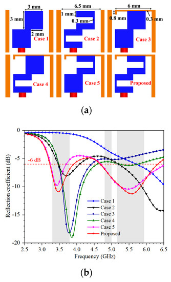 In Figure 2, Case 1 is a simple monopole. By cutting two rectangle slots on the strips of antenna of Case 1, the antenna of Case 2 is obtained. By adding an L-shaped radiation strip on the frame of antenna of Case 1, the antenna of Case 3 is formed that has the character of single band at 3.8 GHz. By cutting a rectangle slot of the antenna of Case 3, the antenna of Case 4 is produced, which gets a better performance compared to that of Case 3. While cutting another rectangle slot of antenna of Case 3, the antenna of Case 5 is formed. By combining the superiority of antennas of Case 4 and Case 5, the proposed antenna element is proposed, which has two resonance points that can fully cover 3.3–3.8 GHz in the lower frequency band and 4.8–5.925 GHz in the higher frequency band.