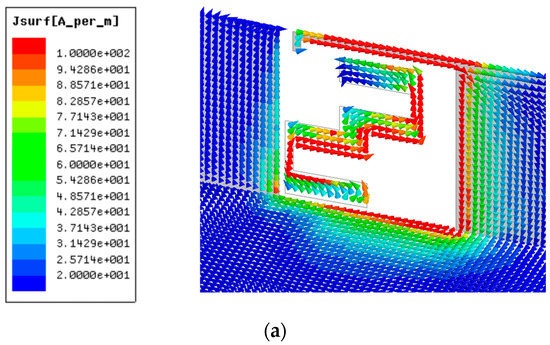Figure 3 show the surface current distribution simulated at 3.5 GHz, 4.9 GHz, and 5.5 GHz. The distribution of the surface current at 3.5 GHz is mainly concentrated at the right side of the frame. On the contrary, the surface current at 4.9 GHz is focused on the left side of the frame. However, the surface current distribution at 5.5 GHz is on the left and top sides.