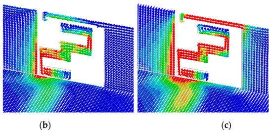 Simulated surface current distribution at (a) 3.5 GHz, (b) 4.9 GHz, and (c) 5.5 GHz.