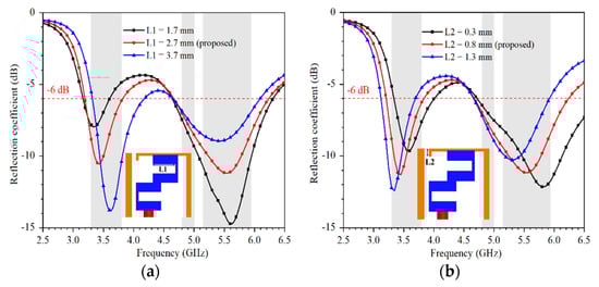 The simulated reflection coefficient as a function of (a) L1, (b) L2.